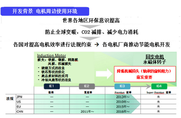 SIAIF推出可有效減少工業(yè)電機(jī)電力消耗的軸承占40%,目前該產(chǎn)品已開始銷售。 隨著世界范圍內(nèi)環(huán)保意識的提高,所有產(chǎn)業(yè)均在推進(jìn)二氧化碳的減排和電力的節(jié)能。尤其是給泵、送風(fēng)機(jī)及壓縮機(jī)等機(jī)械提供驅(qū)動力的工業(yè)電機(jī),其電力消耗占世界消耗總電量的40%以上。針對這些需求,各國均制定了旨在提高工業(yè)電機(jī)效能的相關(guān)法規(guī)。